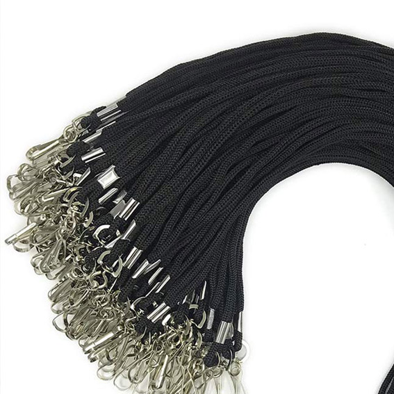 We supply black rope lanyards that have a metal swivel hock. They work perfectly with all of our laminated passes. The lanyards are made from a durable woven material. One size fits all.